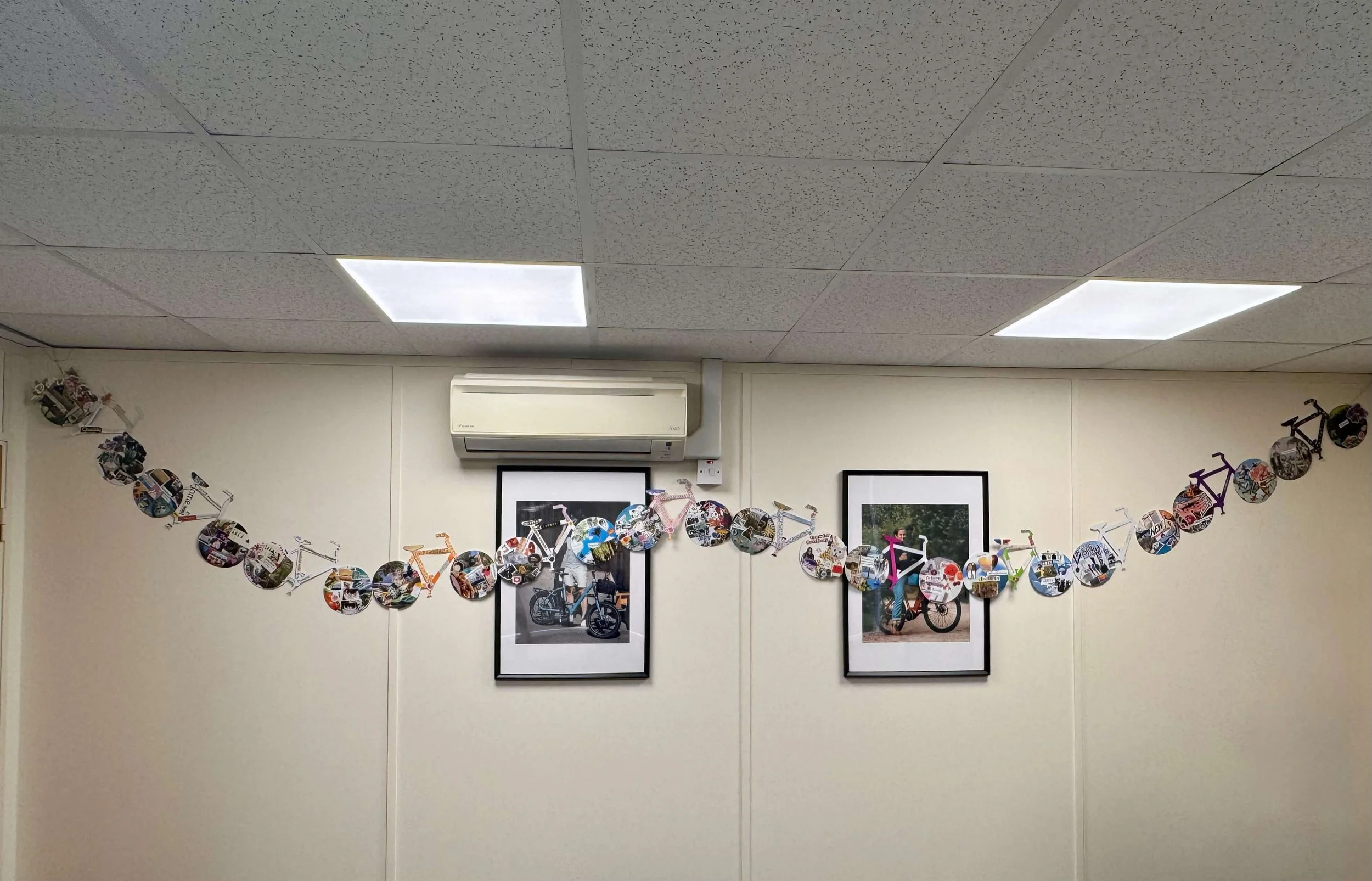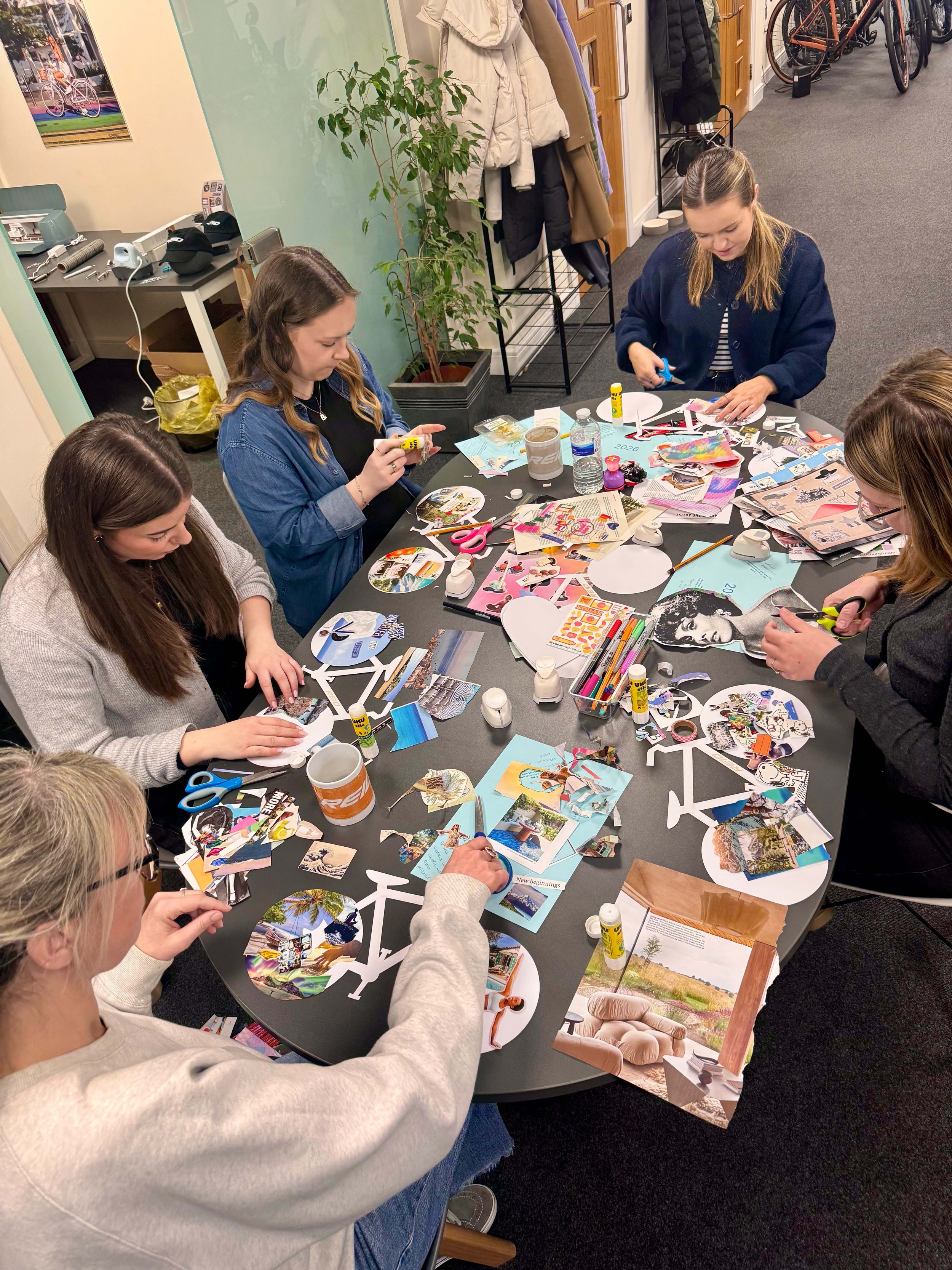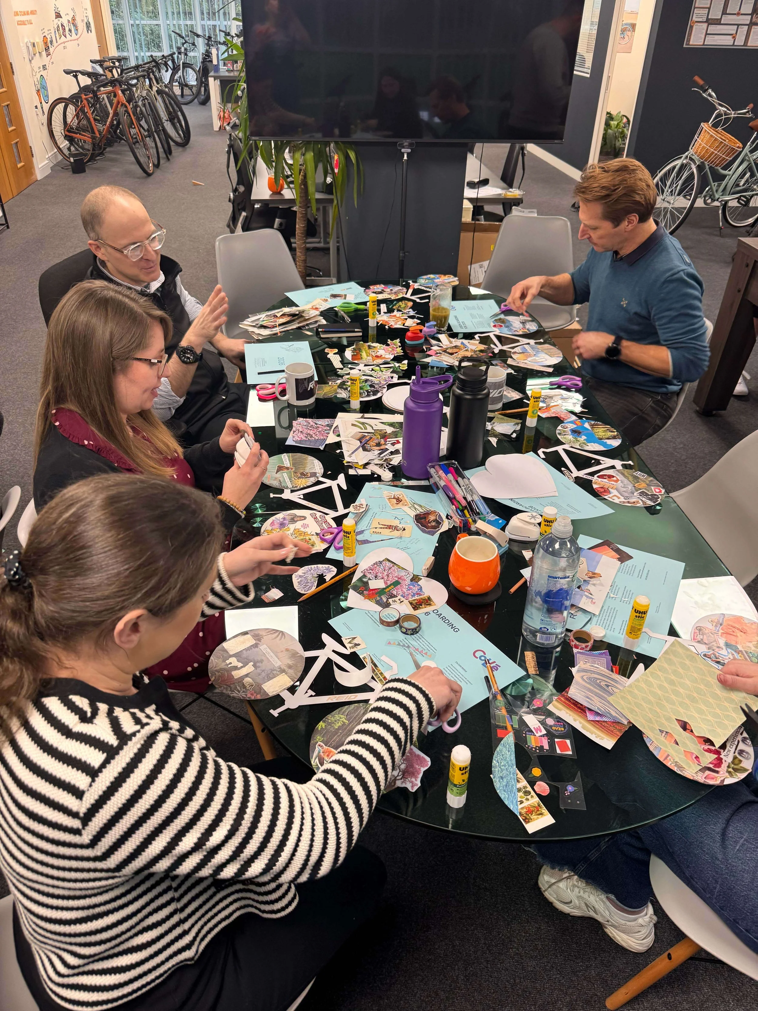 A bespoke creative wellbeing workshop where the team reconnected with what matters most through mindful collage on bike-shaped canvases. Individual vision boards united to create one collaborative artwork, celebrating both unique aspirations and collective support.